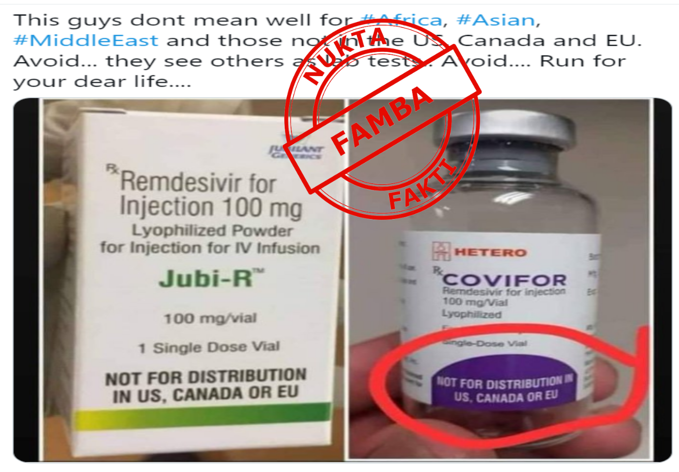 Pia picha ya dawa hiyo zinazosambaa mtandaoni hasa WhatsApp zimeambatana na maneno yanayosema “Wake up Africa, this is not a cure but a trap to kill you or use you as ‘laboratory rat’,” ikimaanisha kuwa “Amkeni Afrika, hiyo siyo dawa bali ni mtego wa kuwaua au kuwatumia nyie kama “panya wa maabala”.