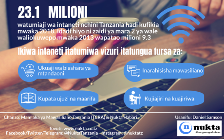 Kwa mujibu takwimu za Mamlaka ya Mawasiliano Tanzania (TCRA) za mwaka 2018, idadi ya watumiaji wa intaneti imefikia milioni 23.1 mwaka juzi kutoka watumiaji wapatao milioni 9.3 waliokuwepo mwaka 2013 ikiwa ni ongezeko la zaidi ya mara mbili katika kipindi hicho.
