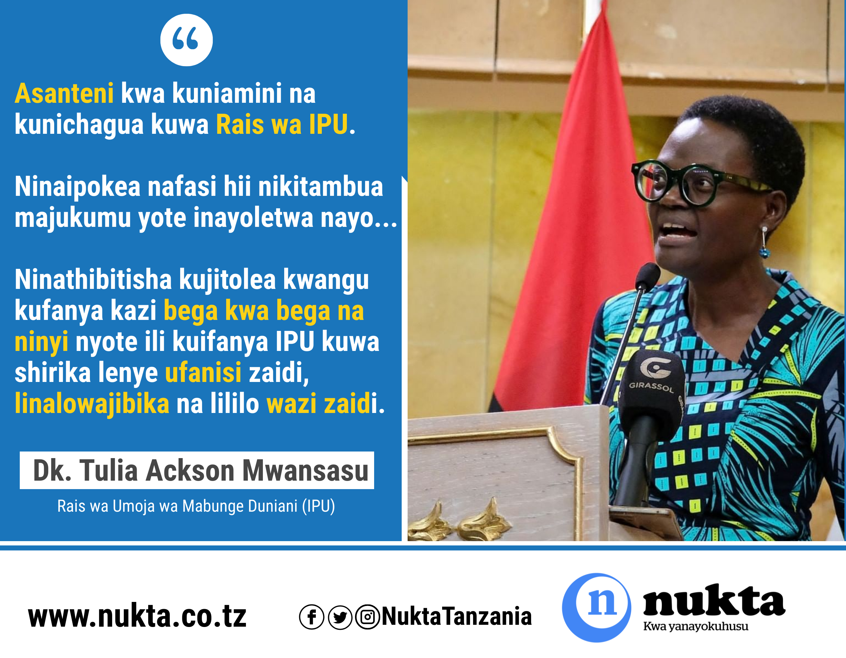 Hata hivyo, Tulia anakuwa mwanamke wa kwanza kutoka Afrika kuwa rais wa IPU ambaye atashikilia nafasi hiyo kwa kipindi cha miaka mitatu.